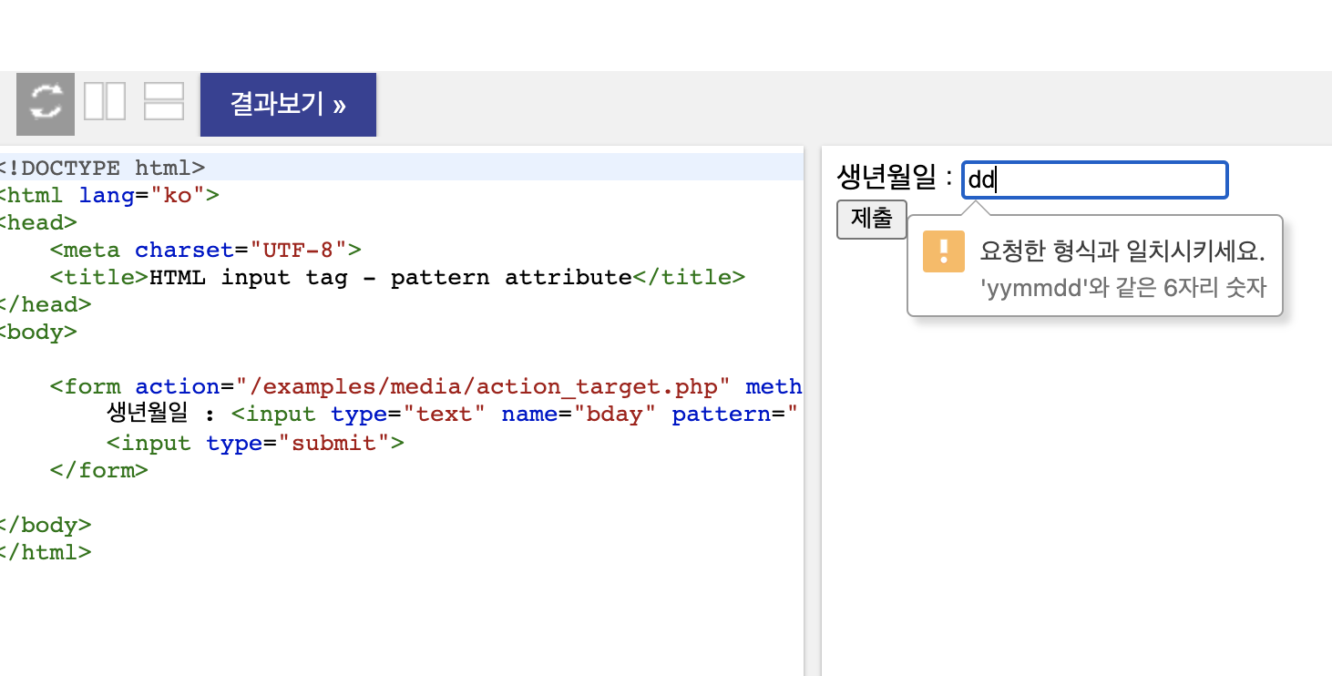 pattern 속성은 양식 제출 시에 요소의 값을 검사하는 정규 표현식을 지정합니다.