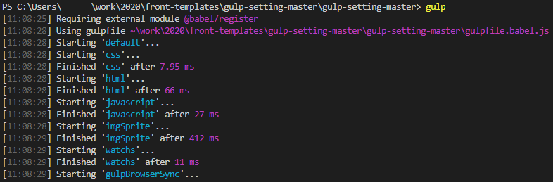 아래처럼 나오면 gulp의 셋팅을 일단락 되었습니다.